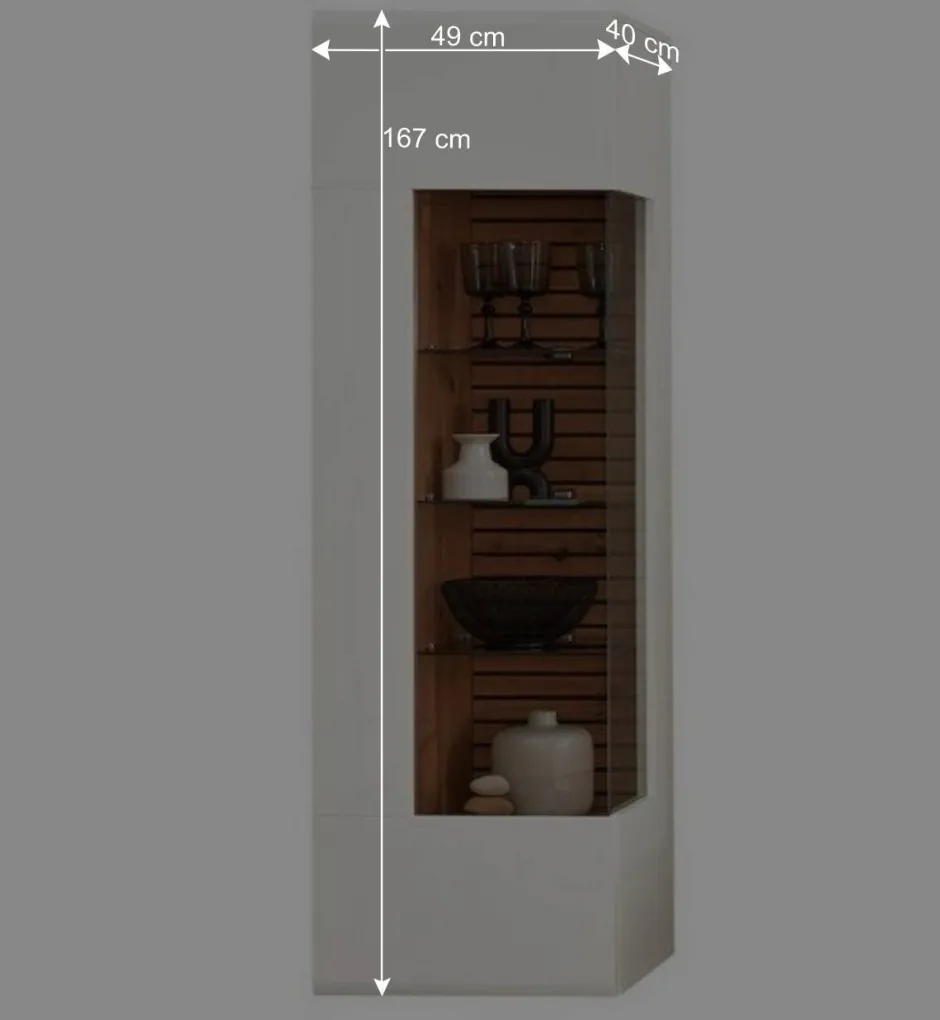Mit den Maßen von 49 cm Breite, 167 cm Höhe und 40 cm Tiefe bietet die Hängevitrine „Niam“ erstaunlich viel Stauraum. Diese großzügigen Abmessungen ermöglichen es Ihnen, verschiedenste Gegenstände ordentlich und übersichtlich zu verstauen, ohne dabei wertvollen Platz im Raum einzunehmen.