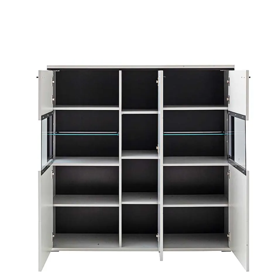 Modernes Design ist mehr als nur ein Stil, es ist eine Philosophie. Es steht für klare Linien, Funktionalität und eine visuelle Ästhetik, die den Raum nicht nur optisch erweitert, sondern auch ein zeitloses Ambiente schafft. Die „Loazin“ Vitrine verkörpert dieses Prinzip durch ihre minimalistische Farbgestaltung und die strukturierte Anordnung der Elemente, wodurch sie zum sofortigen Blickfang wird.