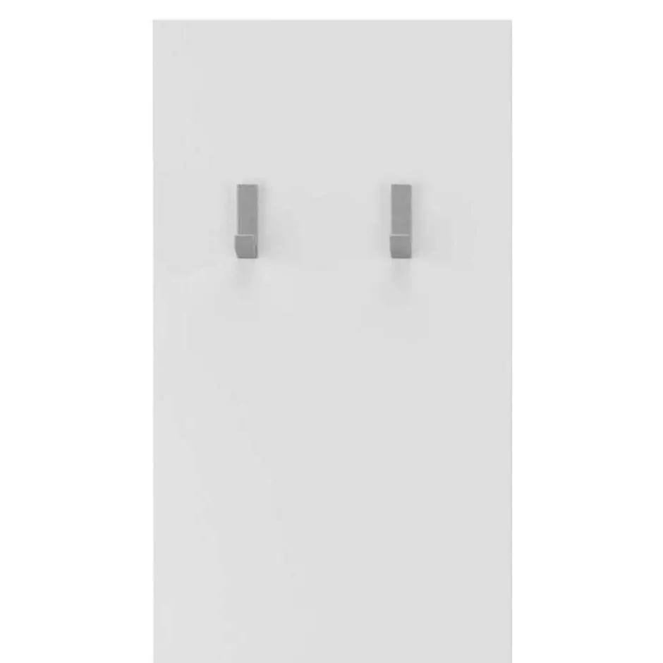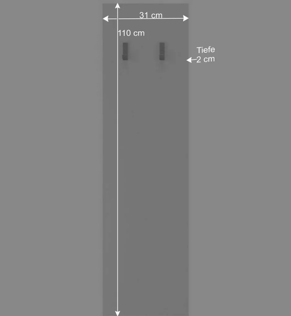 Mit seinen kompakten Maßen von 31 cm Breite, 110 cm Höhe und einer schlanken Tiefe von nur 2 cm eignet sich das Paneel perfekt für kleine Dielen oder schmale Flure. Die durchgehende, stabile Rückwand sorgt für eine feste Wandmontage und gewährleistet einen sicheren Halt. Zwei robuste Metall-Kleiderhaken bieten ausreichend Platz für Jacken, Schals oder Handtaschen und halten Ihre Garderobe stets griffbereit.