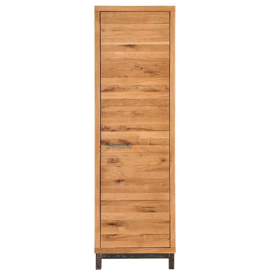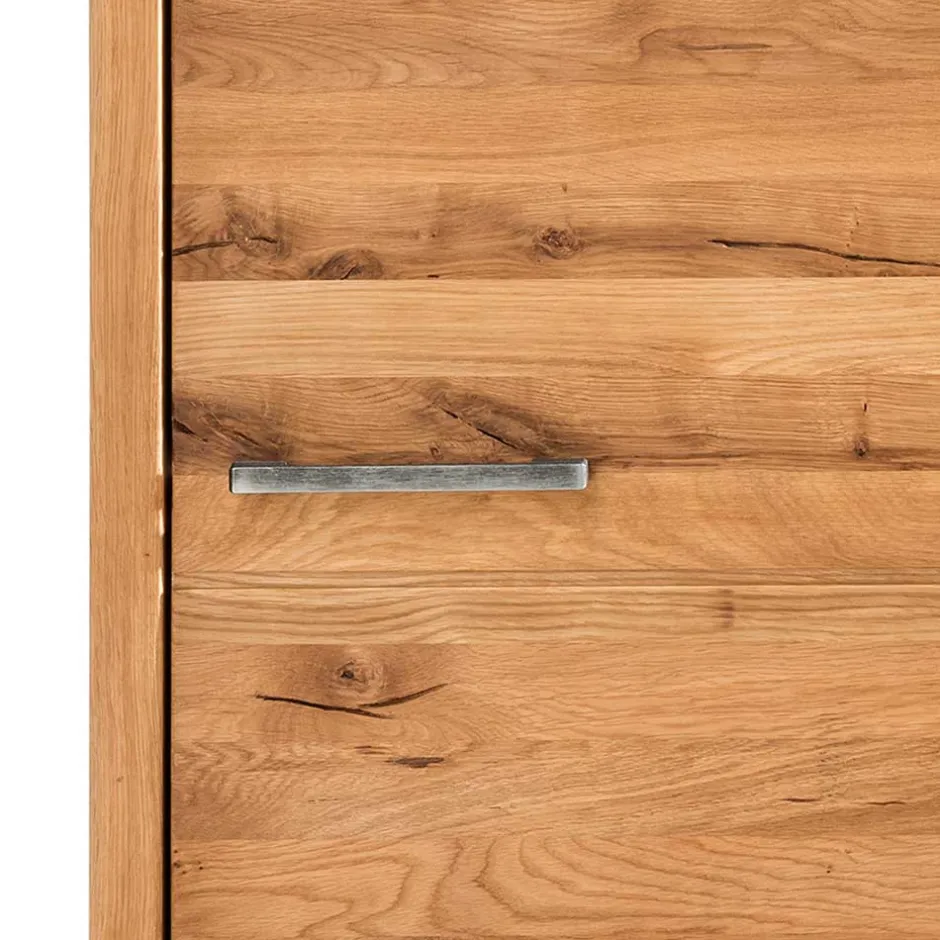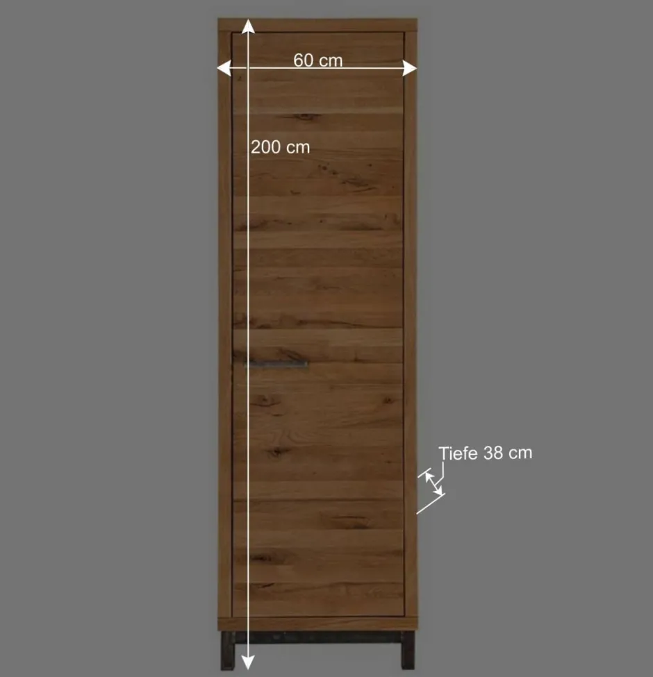 Die Echtholz-Oberfläche des Schranks ist mit Wuchsrissen und Astlöchern versehen und natürlich geölt, was ihm einen rustikalen Charme verleiht. Der Schrank ist mit einer großen Drehtür ausgestattet, die eine Softclose-Funktion aufweist und durch stabile Metallscharniere unterstützt wird. Der praktische Metall-Bügelgriff ermöglicht ein bequemes Öffnen und Schließen der Tür.