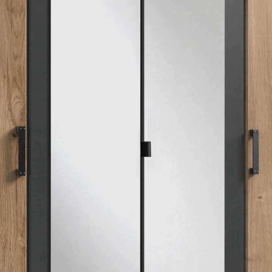 Die äußeren Türfronten sind ein echter Hingucker – sie sind mit trendigen Metall-Applikationen gestaltet, die den urbanen Charakter des Schranks perfekt unterstreichen. Die Kombination aus Plankeneiche und Dunkelgrau in Holzoptik verleiht dem Schrank zudem eine warme und gleichzeitig moderne Ausstrahlung. Dank der folierten Oberflächen profitieren Sie von einer robusten, strapazierfähigen Oberfläche, die für den täglichen Gebrauch bestens geeignet ist und pflegeleicht bleibt.