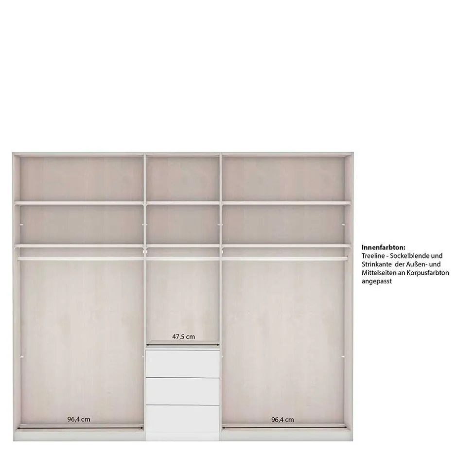 - Drei Fachelemente innen, Breite: 96,4/47,5/96,4 cm, jeweils mit zwei Einlegeböden und einer Kleiderstange ausgestattet