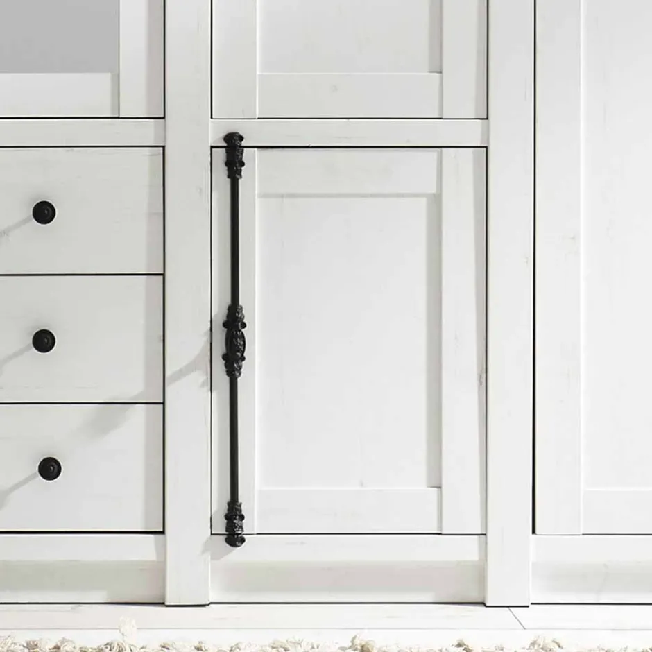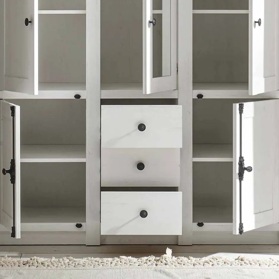 Klassische Knopfgriffe gepaart mit rustikalen Stangengriffen aus schwarzem Metall setzen einen kontrastreichen Akzent und runden das Gesamtbild harmonisch ab. Der Schrank ruht auf einem geschlossenen Sockel und garantiert so einen stabilen und sicheren Stand.