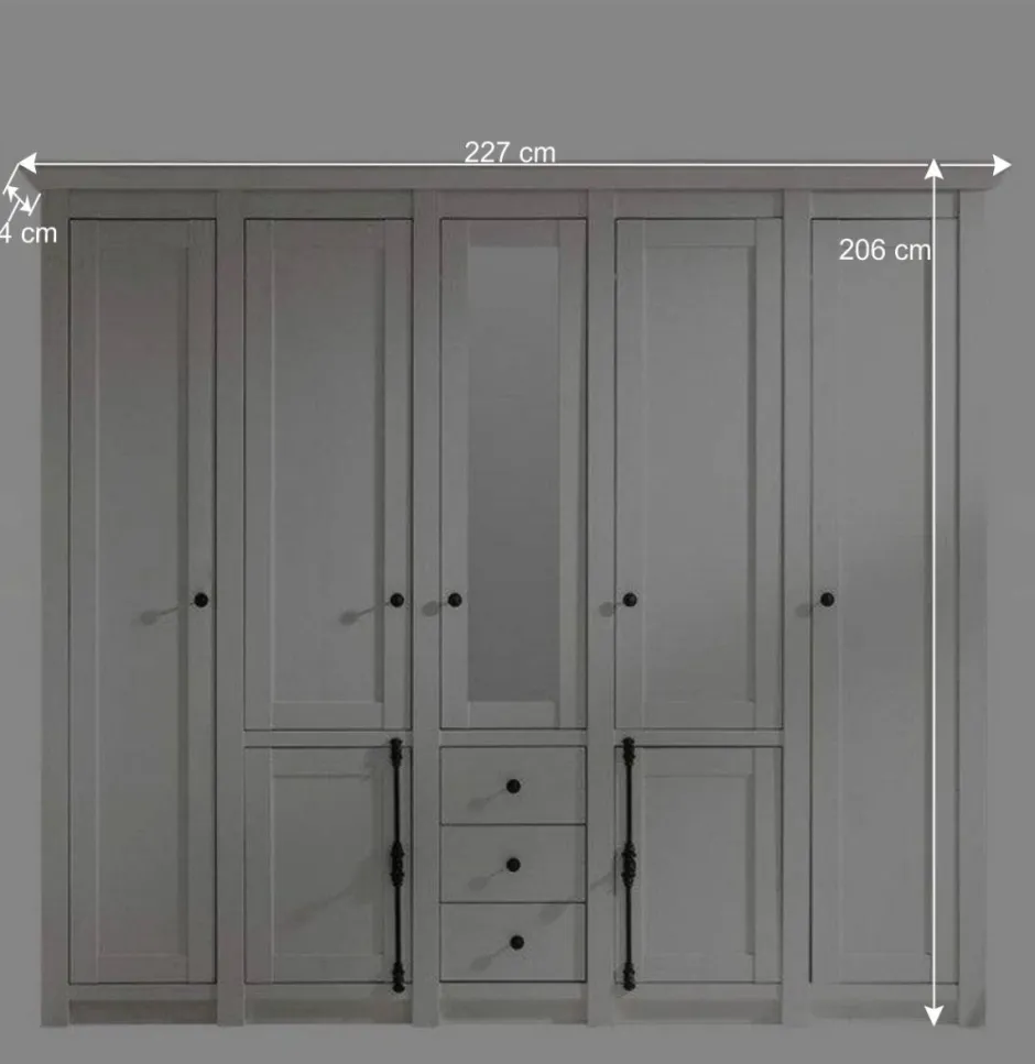 Mit den Maßen von 227 cm Breite, 206 cm Höhe und 64 cm Tiefe bietet dieser Schrank enormen Stauraum für Ihre Kleidung und Accessoires. Insgesamt sieben unterschiedlich große Türen in einer edlen Kassettenoptik sorgen für optische Raffinesse. Ein besonderer Blickfang ist die mittlere Türfront, die mit einem eleganten Spiegel ausgestattet ist. Dieser erweitert nicht nur optisch den Raum, sondern ermöglicht Ihnen auch tägliche Outfit-Checks. Für eine strukturierte Aufbewahrung sorgen eine Hutablage mit Kleiderstange hinter den hohen Türen links und rechts außen sowie hinter der Spiegeltür. Des Weiteren bieten die inneren Türen zusätzlichen Stauraum durch jeweils drei Einlegeböden. Und für all jene Kleinteile, die einen besonderen Platz benötigen, gibt es zusätzlich drei geräumige Schubladen, die auf stabilen Metallauszügen gleiten.
