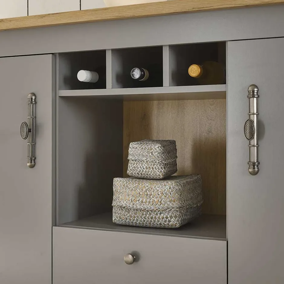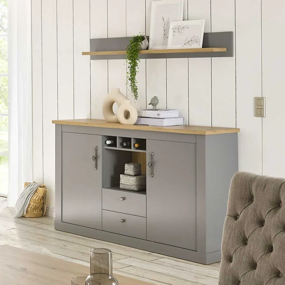 Tauchen Sie ein in die Welt des Landhausstils, der Wärme, Gemütlichkeit und eine Prise Nostalgie in Ihre vier Wände bringt. Unser Sideboard „Buleta“ ist eine Hommage an diesen zeitlosen Stil, interpretiert mit einem modernen Twist. Die harmonische Kombination aus einem sanften Lichtgrau und den natürlichen Akzenten in Holzoptik Eiche schafft eine Atmosphäre, die sowohl beruhigend als auch einladend ist. Dieses Möbelstück ist nicht einfach nur ein Gegenstand in Ihrem Zuhause – es ist eine Erweiterung Ihres Lebensraumes, die Natürlichkeit und Stil verspricht.