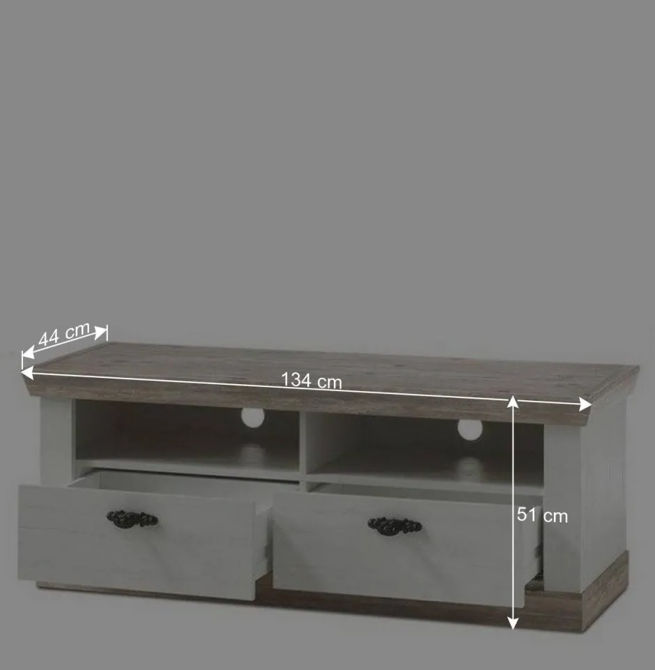Die Möbelstücke sind aus robuster Spanplatte gefertigt und verfügen über Oberflächen in Holzoptik Weiß, die durch Kranzleisten und Sockel in Pinie verwittert foliert abgesetzt werden. Diese zweifarbige Optik verleiht dem Set eine einzigartige Ausstrahlung und sorgt dafür, dass es in jedem Wohnzimmer zum Blickfang wird. Selbst die sichtbaren Rückwände sind farblich abgesetzt und tragen zur Gesamtwirkung bei.