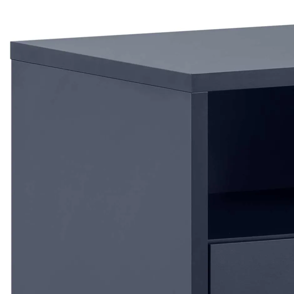 Eleganz und Qualität vereinen sich in der Nachtkommode „Inbano“. Gefertigt in Deutschland steht dieses Möbelstück für höchste Standards in Material und Verarbeitung. Das moderne Design fügt sich nahtlos in jede Einrichtung ein und setzt mit seiner dunkelblauen, melaminbeschichteten Oberfläche und den goldfarbenen Akzenten stilvolle Highlights in Ihrem Schlafzimmer.