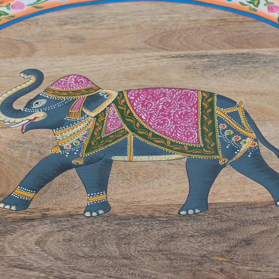 Das absolute Highlight dieses Couchtischs sind die kunstvollen, handbemalten Elefanten-Motive in satten, kräftigen Farben. Jedes Detail wurde mit Liebe zum Handwerk gestaltet und anschließend versiegelt, um die strahlenden Farben dauerhaft zu erhalten. Durch diese aufwendige Bearbeitung ist jeder Tisch ein Einzelstück – keine zwei Exemplare sind exakt gleich.