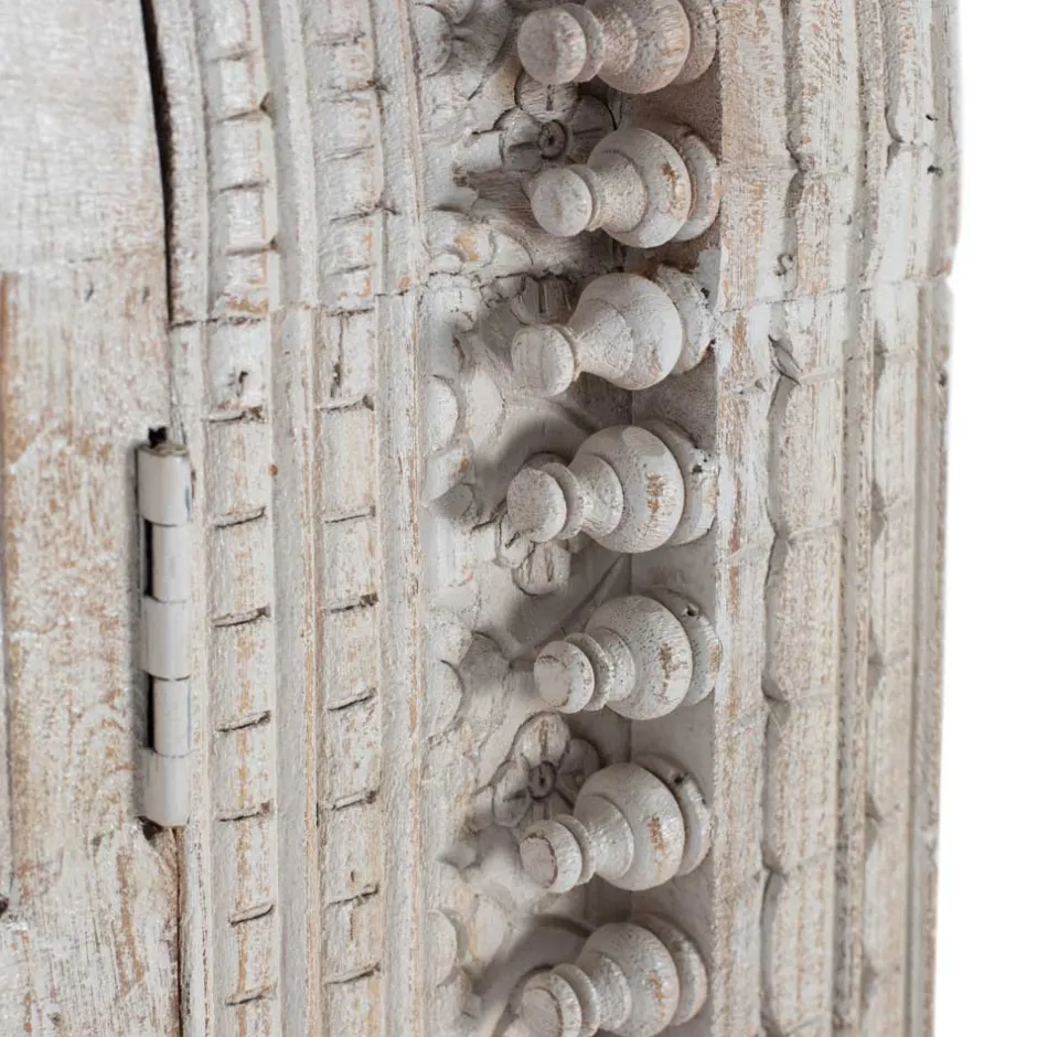 Der „Capo“-Schrank begeistert mit seiner soliden Konstruktion und hochwertigen Materialwahl. Das massive Mangobaumholz verleiht dem Möbelstück nicht nur Stabilität, sondern auch eine natürliche Ausstrahlung. Die Oberfläche wurde mit einem zarten White Wash Effekt behandelt, wodurch eine ansprechende, leicht antike Optik entsteht. Zwei stabile Türen, versehen mit robusten Metallscharnieren, sorgen für eine lange Lebensdauer. Die handlichen, metallenen Bügelgriffe in Antikweiß runden das Gesamtbild ab und bieten gleichzeitig eine angenehme Haptik. Das massives Holzsockelgestell bringt den Schrank sicher in Position und unterstreicht seinen stilvollen Look. Ein weiteres Highlight sind die filigranen Ornamentmuster und die kunstvollen Zierfräsungen, die durch ihre präzise Ausführung das handwerkliche Können zur Geltung bringen. Diese Details machen den „Capo“ zu einem wahren Schmuckstück.