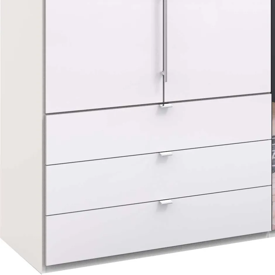 Hergestellt in Deutschland aus wertiger Spanplatte, besticht der Kleiderschrank „Dolienca“ durch seine langlebige Konstruktion und sein modernes, zeitloses Erscheinungsbild. Die Front ist mit einer weißen Glasbeschichtung versehen, während der Korpus in stilvollem Weiß foliert ist. Diese Kombination verleiht dem Schrank einen edlen und eleganten Look, der sich nahtlos in verschiedene Einrichtungsstile integrieren lässt.