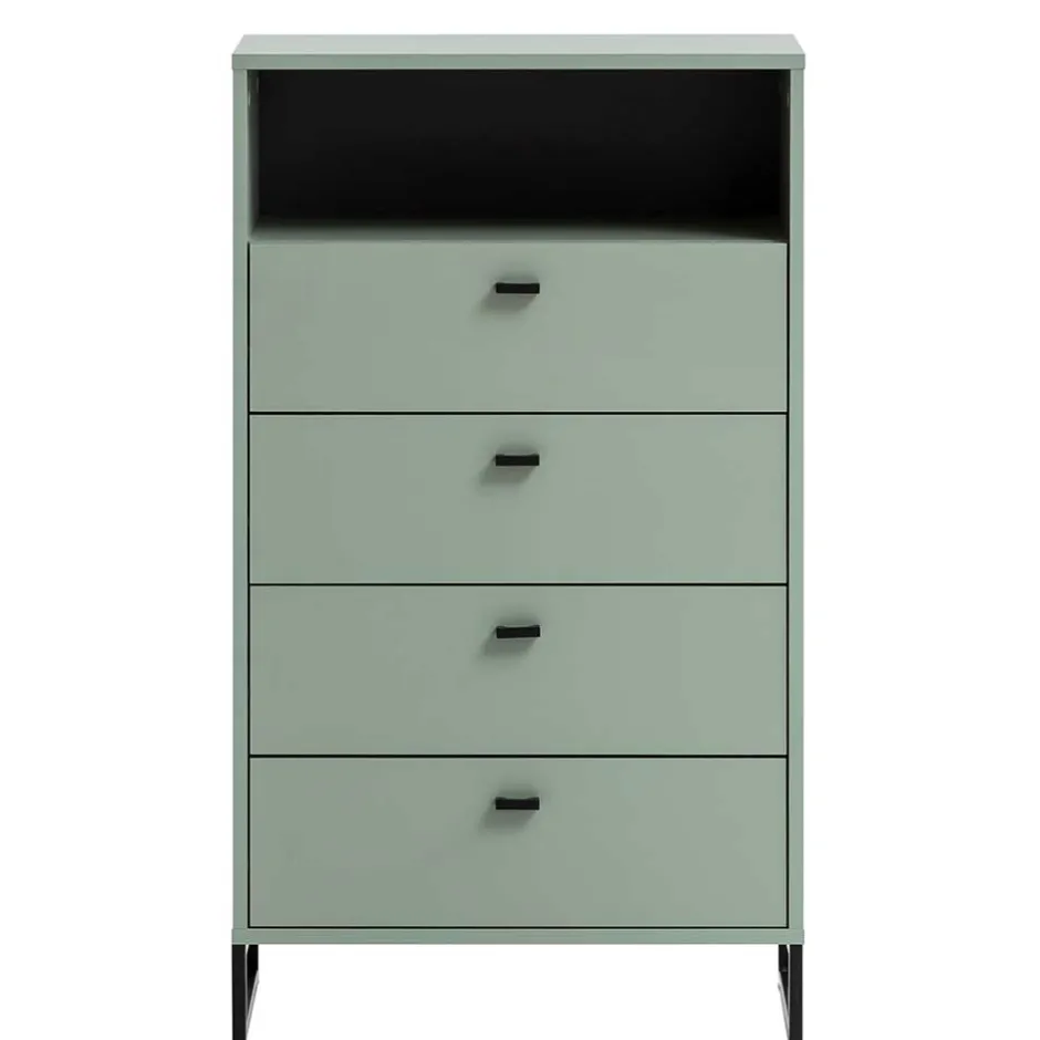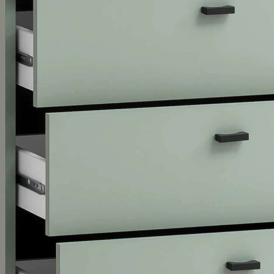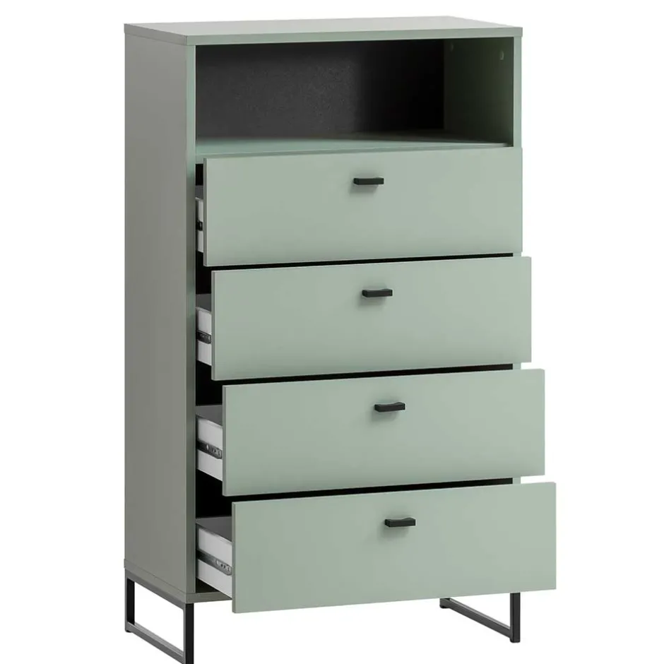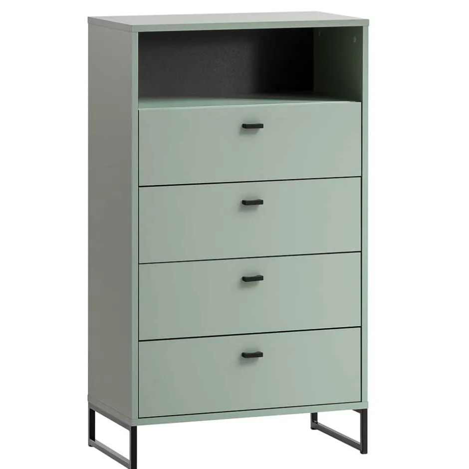 Die Hochkommode ergänzt das Set perfekt und bietet mit ihren vier Schubladen und einem offenen Fach weiteren Stauraum für Kleidung, Accessoires oder alltägliche Gegenstände. Mit den Maßen 60 cm Breite, 104 cm Höhe und 33 cm Tiefe ist sie die ideale Lösung für kleinere Räume, in denen jede Stellfläche optimal genutzt werden soll. Die Schubladen auf stabilen Metallauszügen gleiten mühelos und bieten großzügigen Platz für all Ihre Utensilien. Auch hier runden die matten, graugrün melaminbeschichteten Oberflächen und die schwarzen Metallgriffleisten das Design stimmig ab. Ein schwarzes Metallbügelgestell sorgt für einen sicheren Stand; eine Kippsicherung wird empfohlen.