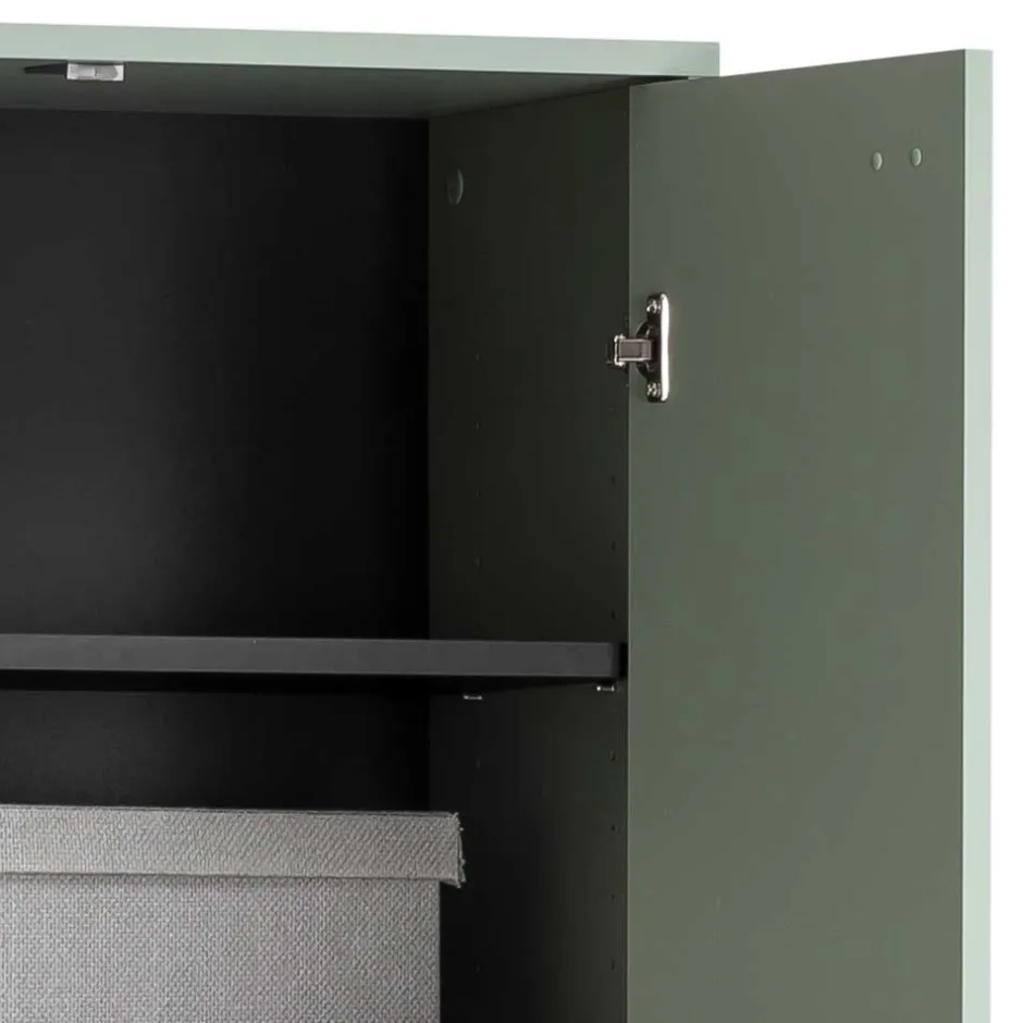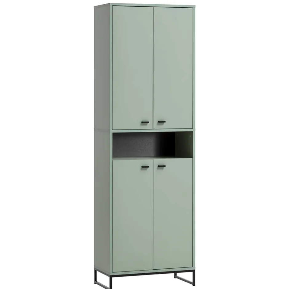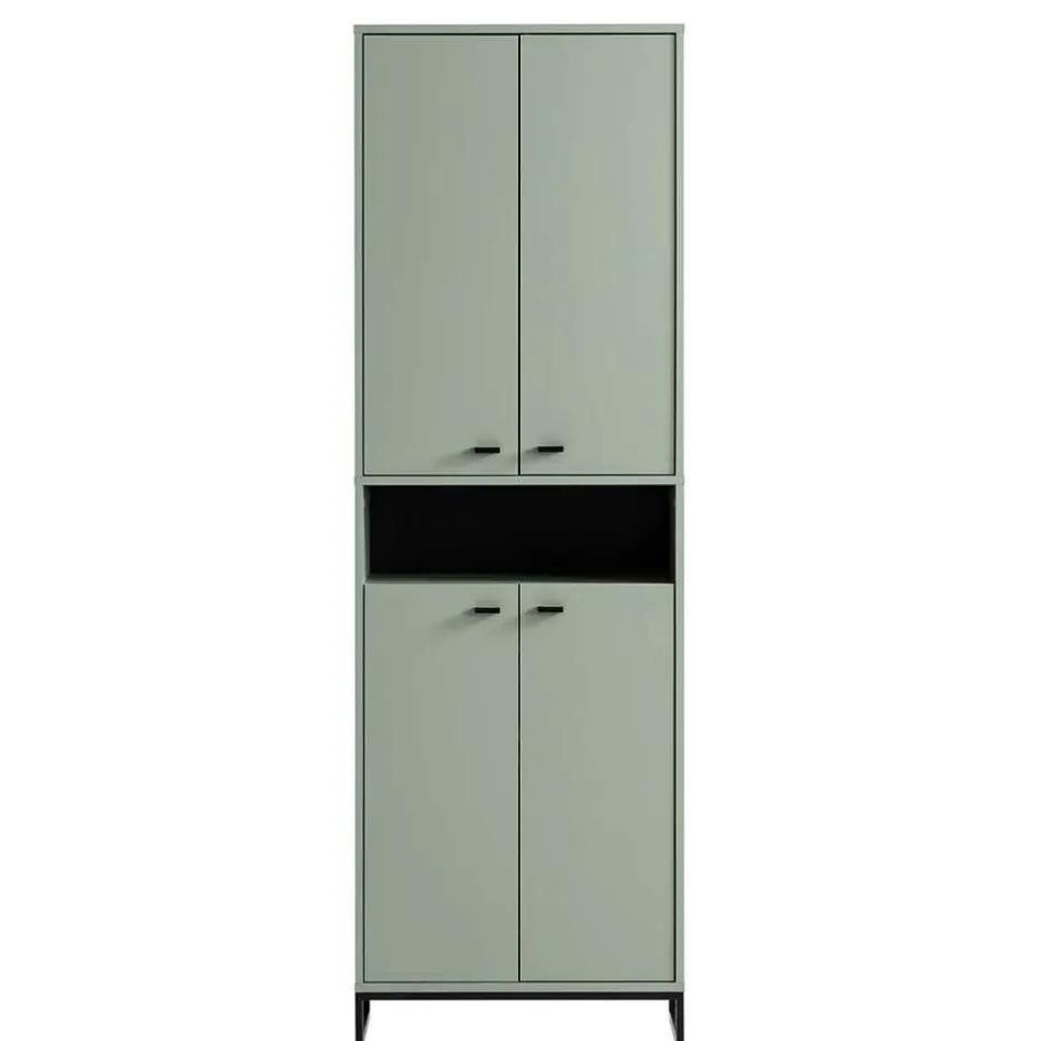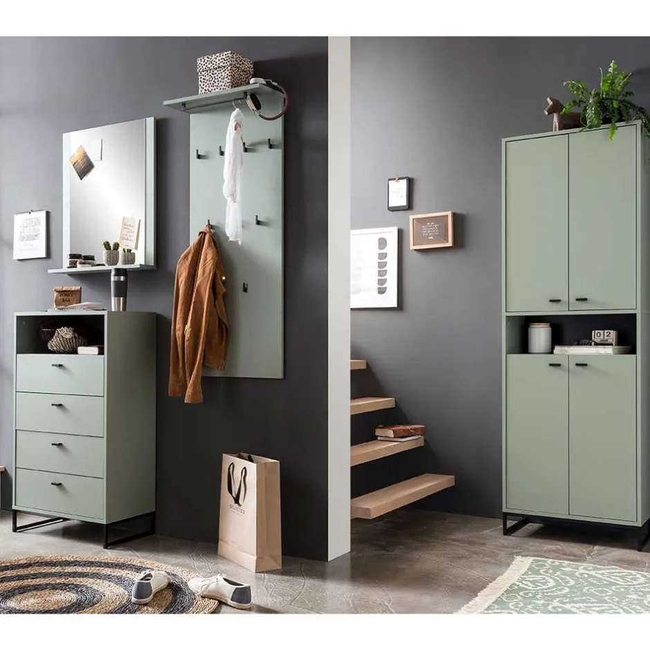 Die Hochkommode ergänzt das Set perfekt und bietet mit ihren vier Schubladen und einem offenen Fach weiteren Stauraum für Kleidung, Accessoires oder alltägliche Gegenstände. Mit den Maßen 60 cm Breite, 104 cm Höhe und 33 cm Tiefe ist sie die ideale Lösung für kleinere Räume, in denen jede Stellfläche optimal genutzt werden soll. Die Schubladen auf stabilen Metallauszügen gleiten mühelos und bieten großzügigen Platz für all Ihre Utensilien. Auch hier runden die matten, graugrün melaminbeschichteten Oberflächen und die schwarzen Metallgriffleisten das Design stimmig ab. Ein schwarzes Metallbügelgestell sorgt für einen sicheren Stand; eine Kippsicherung wird empfohlen.
