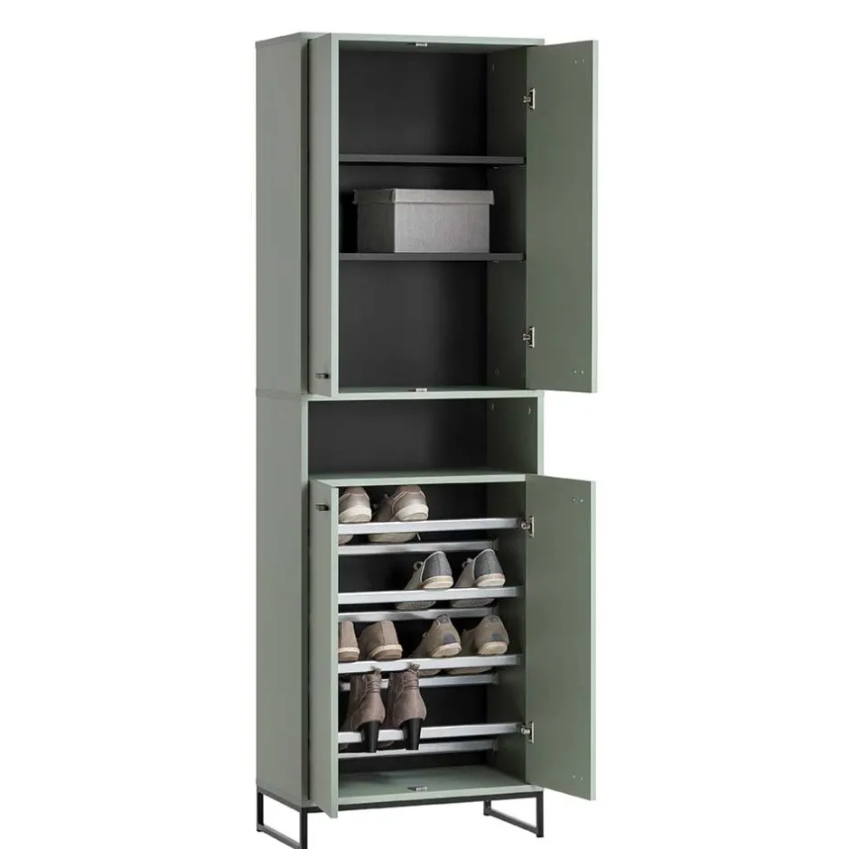 Mit einer Breite von 60 cm, einer Höhe von 186 cm und einer Tiefe von 33 cm bietet der Hochschrank aus deutscher Produktion reichlich Stauraum, ohne viel Platz in Anspruch zu nehmen. Hinter den vier Drehtüren verbergen sich verstellbare Einlegeböden und vier Schuhreihen, die Platz für bis zu acht Paar Schuhe (bis Größe 45) bieten. Ein offenes Fach zwischen den Türen setzt dekorative Akzente und bietet zusätzlichen Raum für Accessoires. Die stabilen Metallbeschläge und schwarzen Metallgriffleisten sorgen für eine leichte Bedienung und unterstreichen das moderne Design. Das schwarze Metallbügelgestell verleiht dem Schrank nicht nur Stabilität, sondern sorgt auch für einen schwebenden Look. Für zusätzliche Sicherheit ist eine Kippsicherung erforderlich.