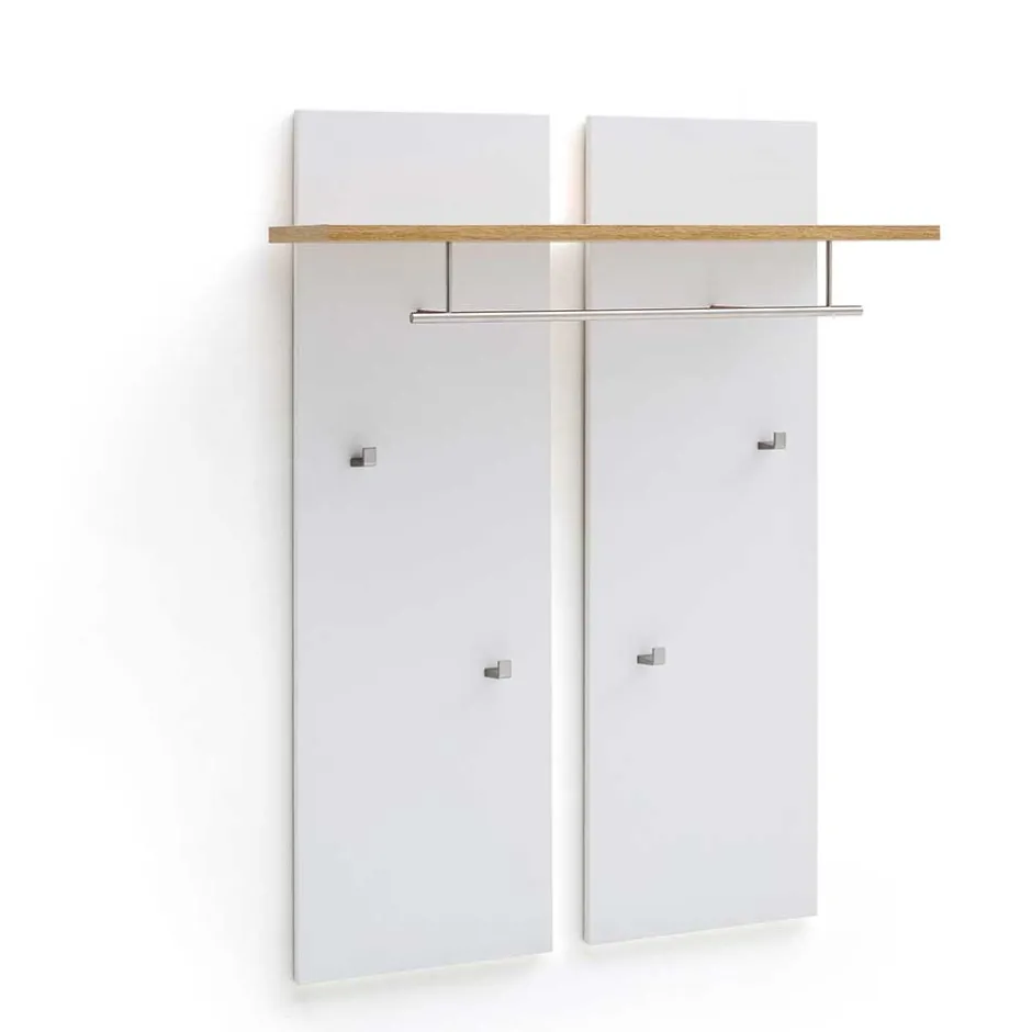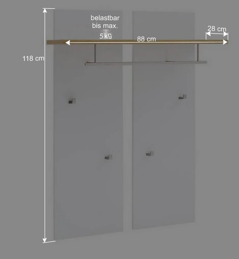 Das Paneel kommt mit vier fest montierten Kleiderhaken, die eine ideale Lösung bieten, um Ihre Jacken und Taschen ordentlich aufzubewahren. Besonders hervorzuheben ist die dekorative Rückwand, die das Paneel in zwei Teile unterteilt und so eine optische Tiefe schafft. Diese durchdachte Gestaltung sorgt nicht nur für mehr Stauraum, sondern auch für eine ansprechende Optik, die jedes Zuhause bereichert.