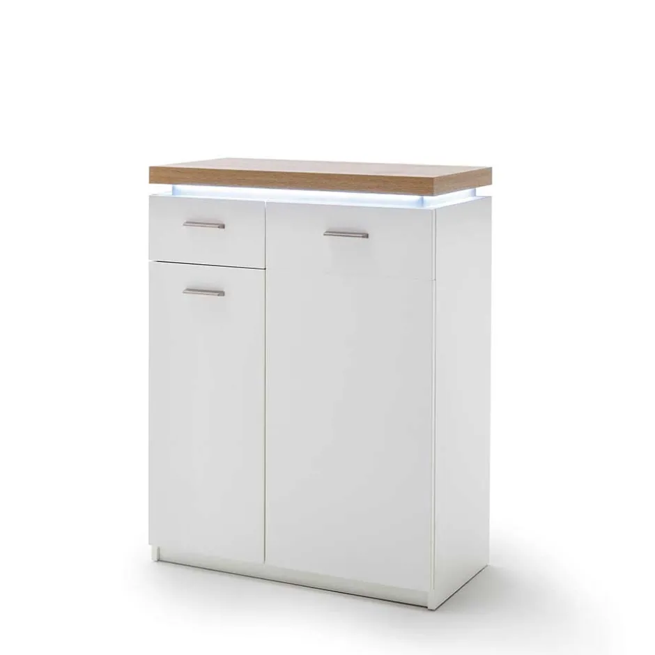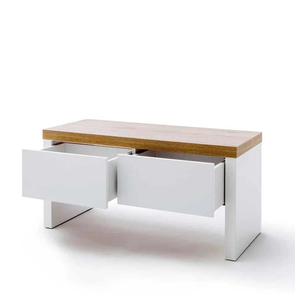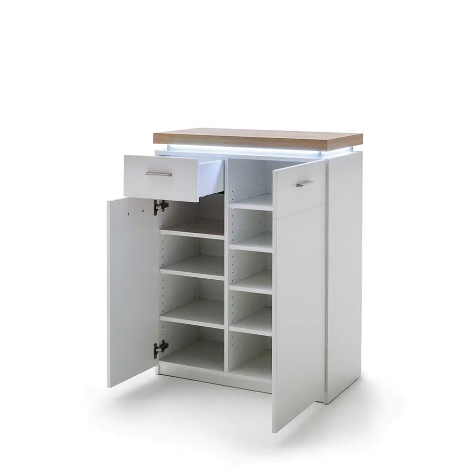 Zusätzlich wird der Oberboden mit einer ansprechenden Holzoptik in Wildeiche abgesetzt. Diese feine optische Abgrenzung verleiht den Möbelstücken einen individuellen, modernen Charakter und sorgt dafür, dass Ihre Garderobe nicht nur funktional, sondern auch ein echter Blickfang ist. Das Melaminbeschichtungsverfahren ist besonders pflegeleicht und schützt die Oberflächen zuverlässig vor äußeren Einflüssen.