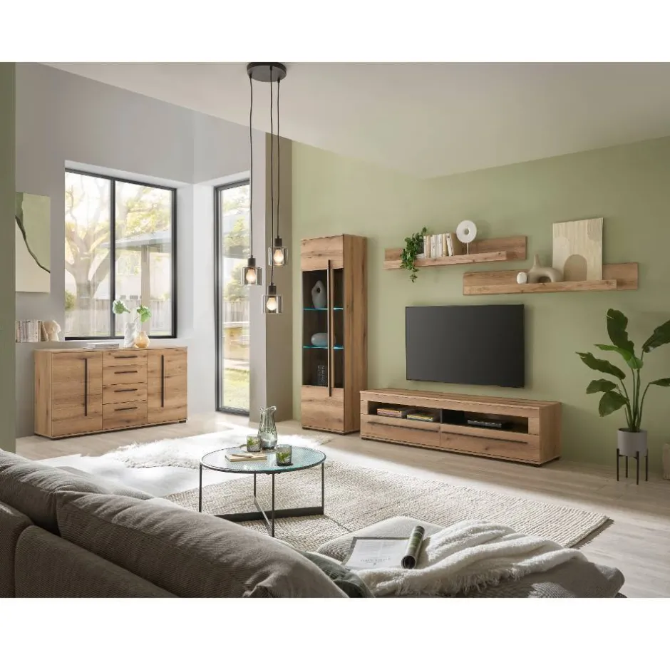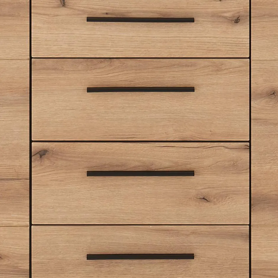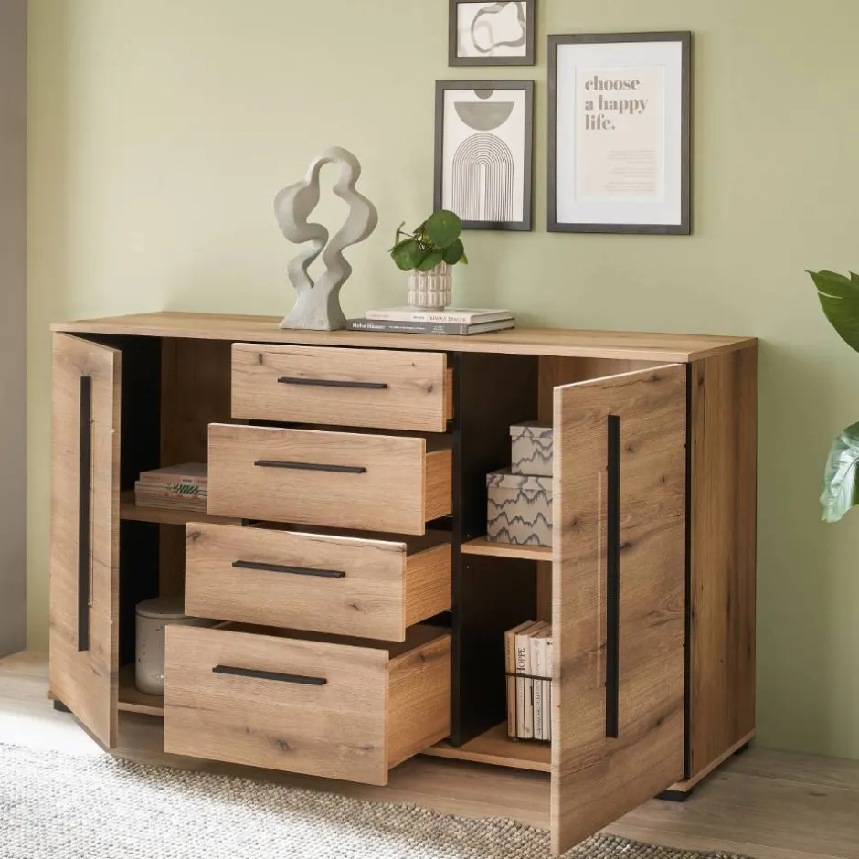 Die Front des Sideboards besteht aus hochwertigem MDF. Dieses Material steht für außergewöhnliche Stabilität, verzugsfreie Formtreue und eine angenehm glatte Oberfläche. Dank des tiefgezogenen Frontdekors wirkt die Oberfläche besonders edel und hochwertig – fast, als wäre sie aus einem Guss. Der Korpus aus strapazierfähiger Spanplatte ist mit einer pflegeleichten Folie in Eiche-Holzoptik beschichtet. Das verleiht dem Möbel nicht nur eine warme, natürliche Ausstrahlung, sondern sorgt auch dafür, dass es widerstandsfähig gegenüber Feuchtigkeit und Kratzern bleibt. So sieht es auch nach Jahren noch aus wie am ersten Tag.