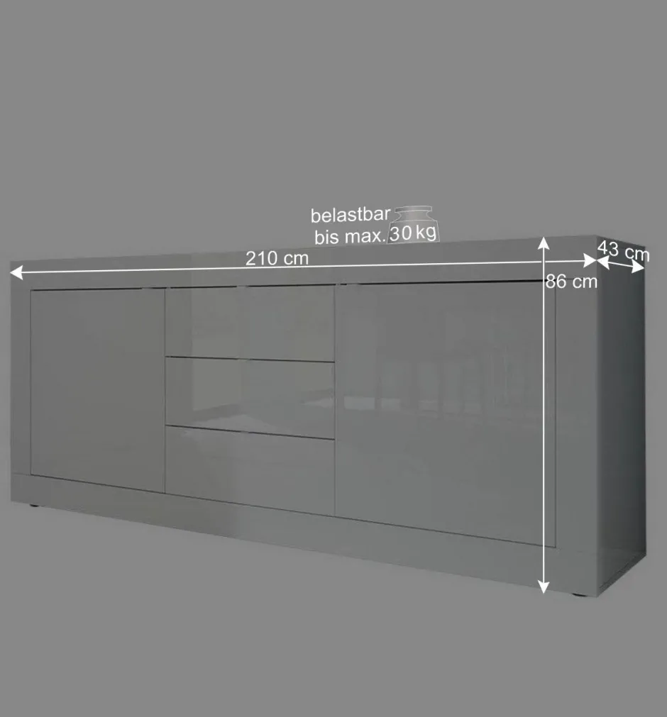 Mit Maßen von 210 cm Breite, 86 cm Höhe und 43 cm Tiefe bietet das Sideboard „Sogno“ reichlich Stauraum. Die Außentüren verbergen jeweils einen Einlegeboden, der bis zu 10 kg belasten kann, ideal für Bücher, Geschirr oder Dekorationsartikel. Die Deckplatte kann mit bis zu 30 kg beladen werden – perfekt für Ihre schönsten Erinnerungsstücke oder eine stilvolle Tischlampe. In den drei mittigen Schubkästen, die auf robusten Metallauszügen gleiten, finden kleinere Gegenstände ihren Platz. Und dank der minimalistischen Metallgriffe ist die Handhabung ein Kinderspiel.