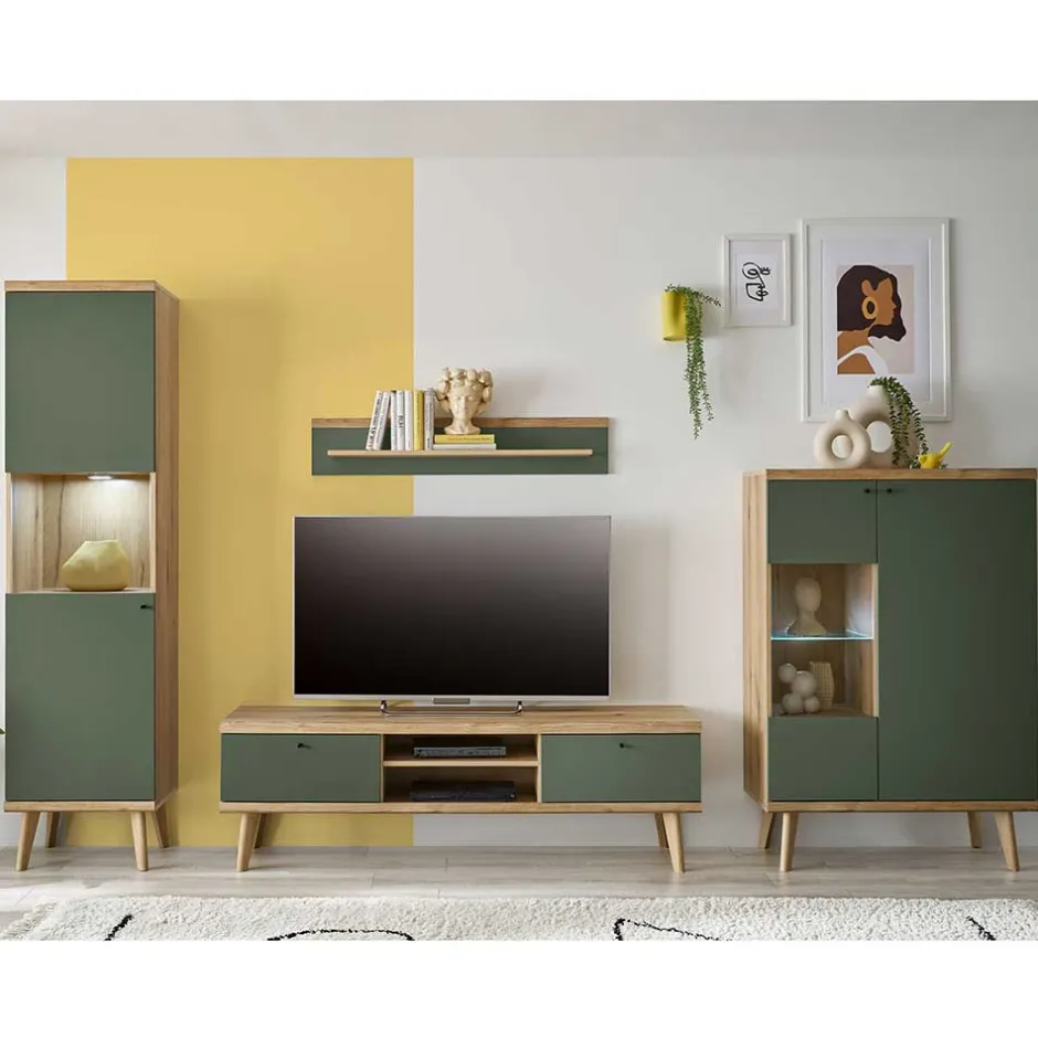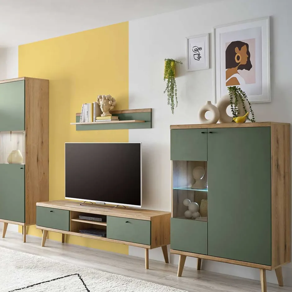 - Schicke Wohnwand in Graugrün und Wildeichefarben
