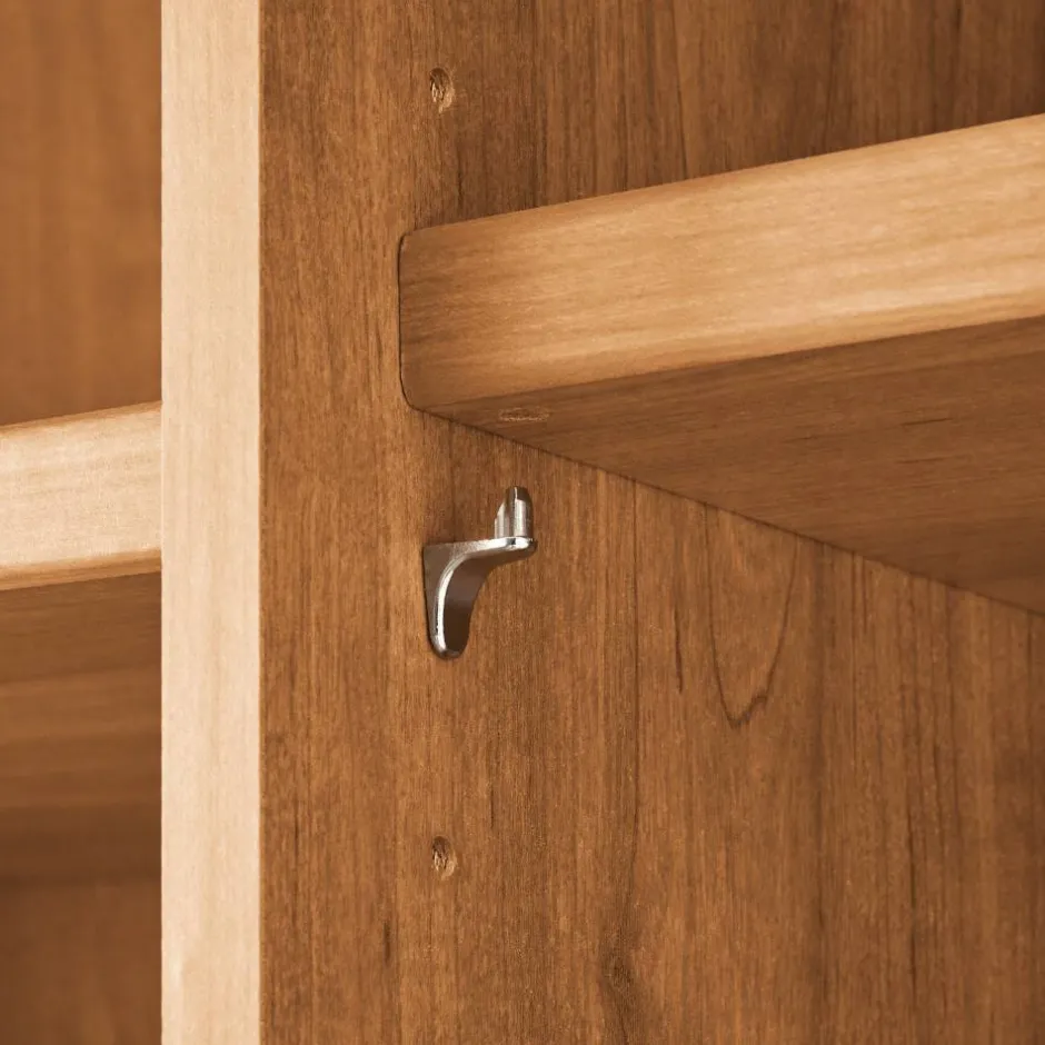 Die Rückwände aus eingenuteter Hartfaser werden pro Abteil mit vier Metallhaltern fixiert – das sorgt für zusätzliche Festigkeit. Der Schrank steht auf einer durchgehenden Sockelkonstruktion und muss zur Kippsicherung an der Wand befestigt werden. Mit einer Tiefe von 58 cm und zwei wählbaren Höhen (216 cm oder 236 cm) passt sich „Hung“ flexibel Ihren räumlichen Anforderungen an.
