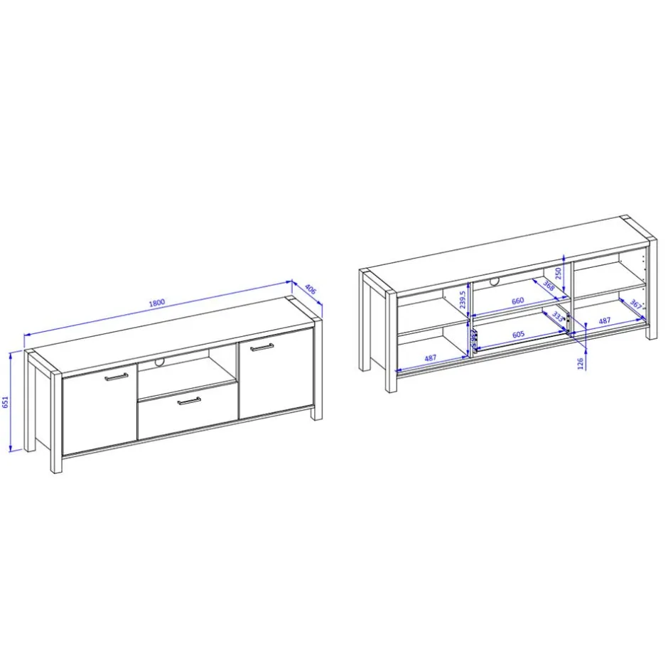 Mit einer Breite von 180 cm, einer Höhe von 65 cm und einer Tiefe von 41 cm ist dieser Unterschrank ideal für Fernseher verschiedener Größen, wobei er besonders gut für größere Bildschirme geeignet ist. Er bietet reichlich Stauraum für Ihre Mediengeräte und Zubehör. Im offenen Gerätefach mit den Innenmaßen von ca. 66x25x36,8 cm, ausgestattet mit einer praktischen Kabelführung, lassen sich Receiver und Spielkonsolen übersichtlich und griffbereit platzieren.