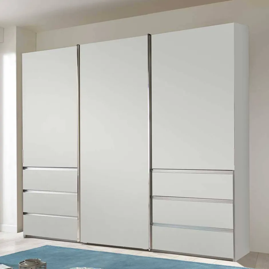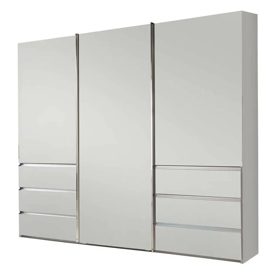 Hinter den eleganten Schwebetüren verbergen sich drei großzügige Facheinheiten, jede mit einer Breite von 96,4 cm. Jede Facheinheit ist mit einer stabilen Kleiderstange aus Metall und zwei praktischen Einlegeböden ausgestattet, die reichlich Platz für Ihre Kleidung und Accessoires bieten. Zusätzlich finden Sie jeweils links und rechts drei geräumige Schubkästen mit Metallauszug. Dank der Soft-Close-Funktion und dem Selbsteinzug schließen diese Schubkästen sanft und leise, was den Komfort im Alltag deutlich erhöht.