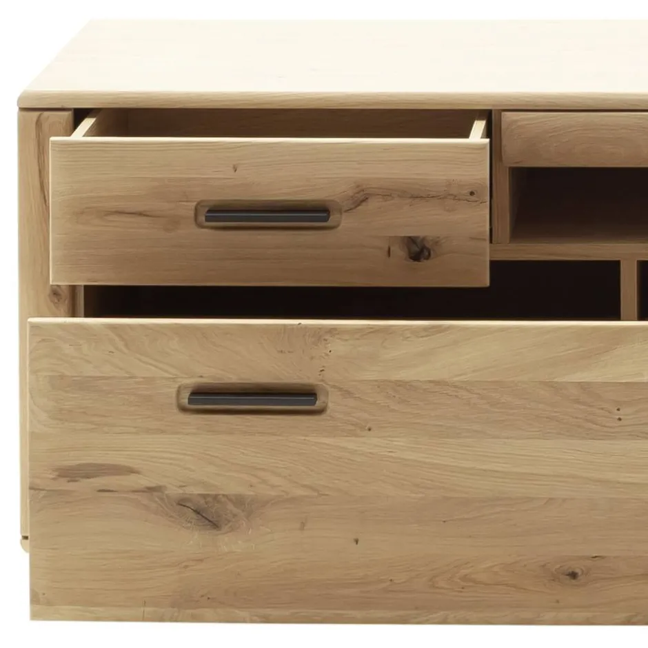 - Teilmassiv aus Ast-, Balkeneiche Massivholz mit durchgehender Lamelle (Front) und Spanplatte (Korpus) gefertigt