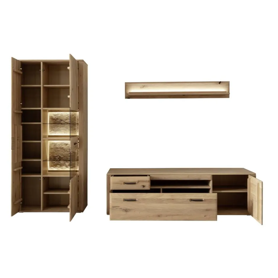 Das dreiteilige Wohnzimmer-Set „Jevedaz“ ist die ideale Lösung für alle, die natürliche Materialien, hohe Funktionalität und eine klare, moderne Formensprache schätzen. Gefertigt aus hell geölter Ast- und Balkeneiche in Kombination mit furnierter Spanplatte, vereint dieses Möbelprogramm handwerkliche Qualität mit zeitgemäßem Wohnkomfort. Die markanten Massivholz-Fronten mit durchgehender Lamelle und die stilvoll abgestimmten Metall-Details verleihen jedem Raum eine natürliche, wertige Atmosphäre.