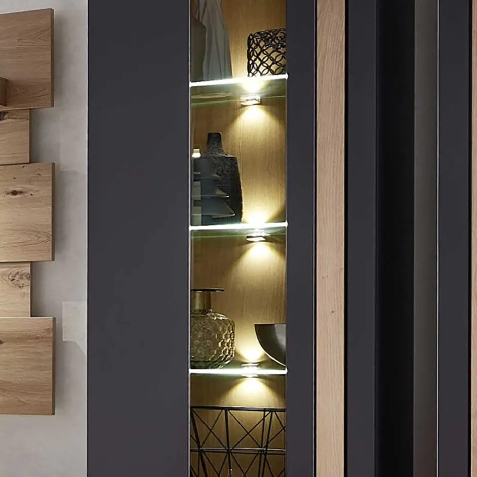 Die „Svanjon“ Wandvitrine begeistert mit ihrer supermatten Oberfläche in edlem Dunkelgrau, die durch die Absetzungen und das Innendekor in der warmen Holzoptik der Wildeiche perfekt abgerundet wird. Die spezielle Folierung sorgt dabei nicht nur für eine ansprechende Optik, sondern macht das Möbelstück auch besonders pflegeleicht. Verschmutzungen lassen sich einfach und schnell entfernen, was Ihnen ein dauerhaft schönes und gepflegtes Aussehen Ihrer Vitrine sichert.