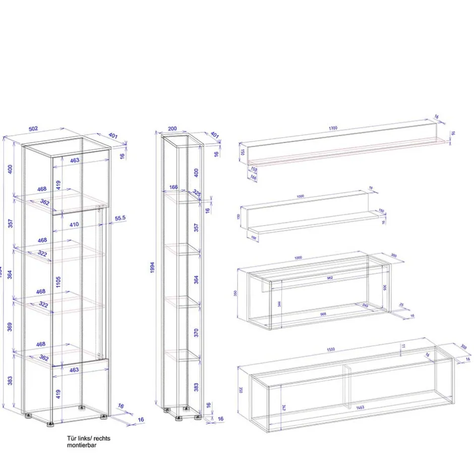 Diese Wohnwand besteht aus verschiedenen Elementen: einem Hängeschrank, einem Hängesekretär, einem Regal, einem Schrank sowie einem breiten und einem schmalen Wandboard. Diese Vielfalt ermöglicht es Ihnen, Ihre Wohnwand individuell zu gestalten und perfekt an Ihren Wohnraum anzupassen.